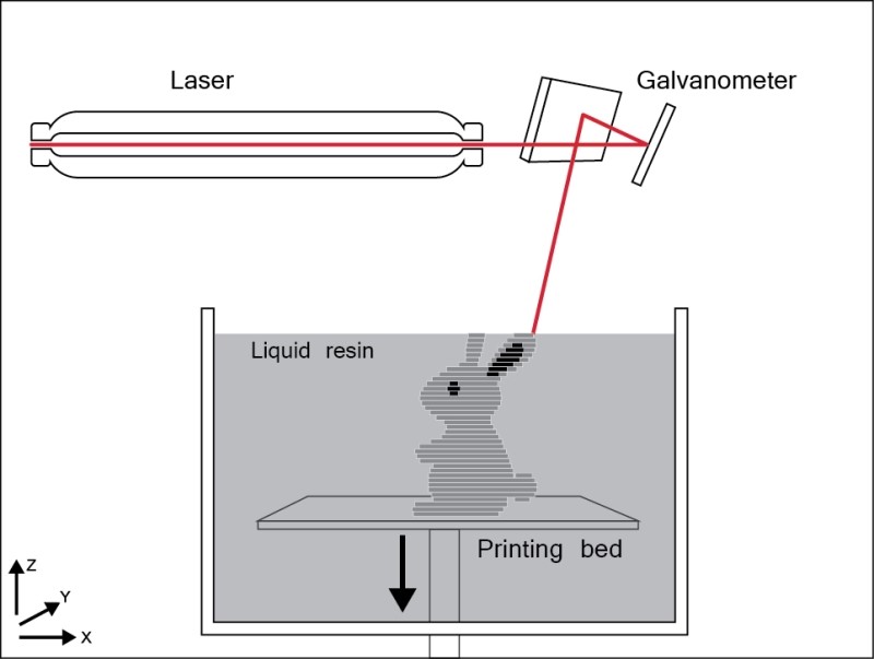 DLP방식과 차이점은 SLA는 레이저 광선이 갈바노미터가 조절한 위치에 쏘이게 되고, 한층 한층 레이어를 그려나갑니다.