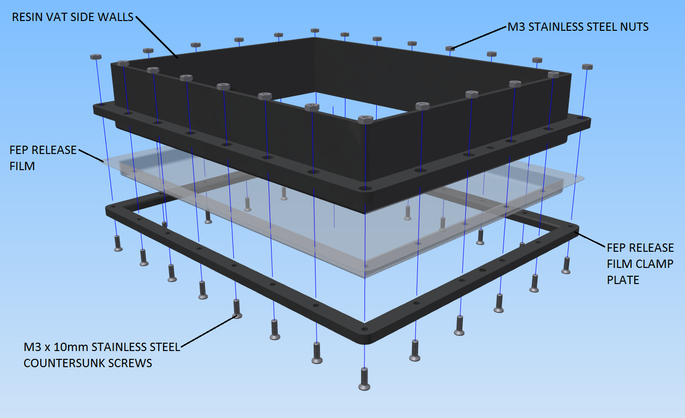 VAT은 레진 용액을 담기위한 수조라고 보시면 되는데, FEP 필름과 VAT을 클램프로 고정하여 레진 용액을 저장합니다.