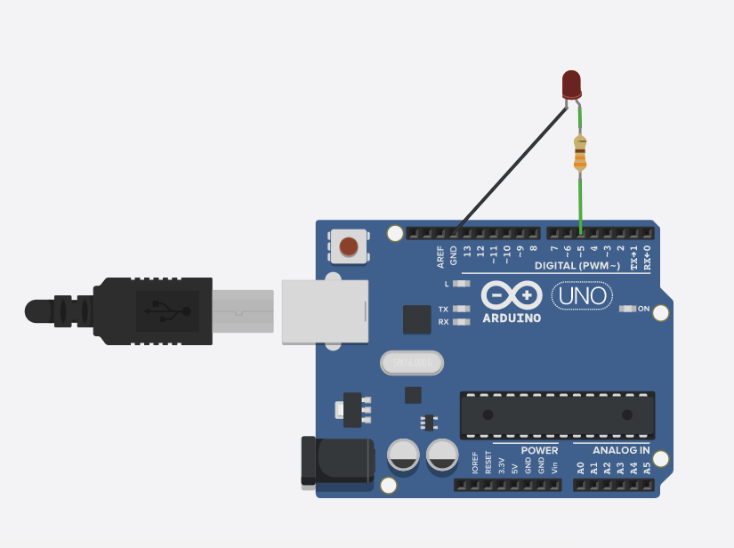 간단한 숙제로 13번 LED가 아닌 5번 핀에 LED를 연결하여 LED를 0.5초 단위로 켜졌다 꺼졌다 하는 코드를 작성하고