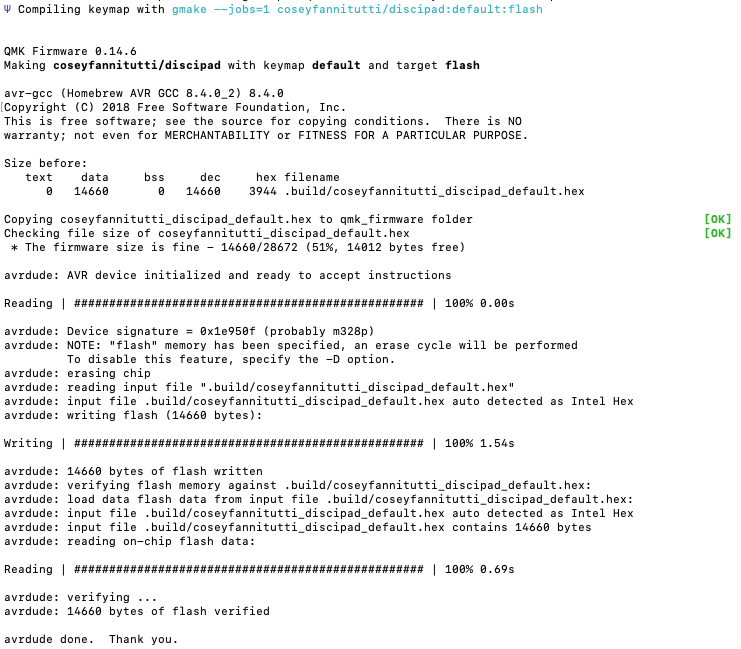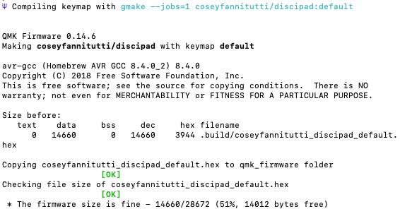 기본 설정대로 따라했다면 위와 같은 텍스트가 뜨고 ~/qmk_firmware 디렉토리에 빌드됩니다.