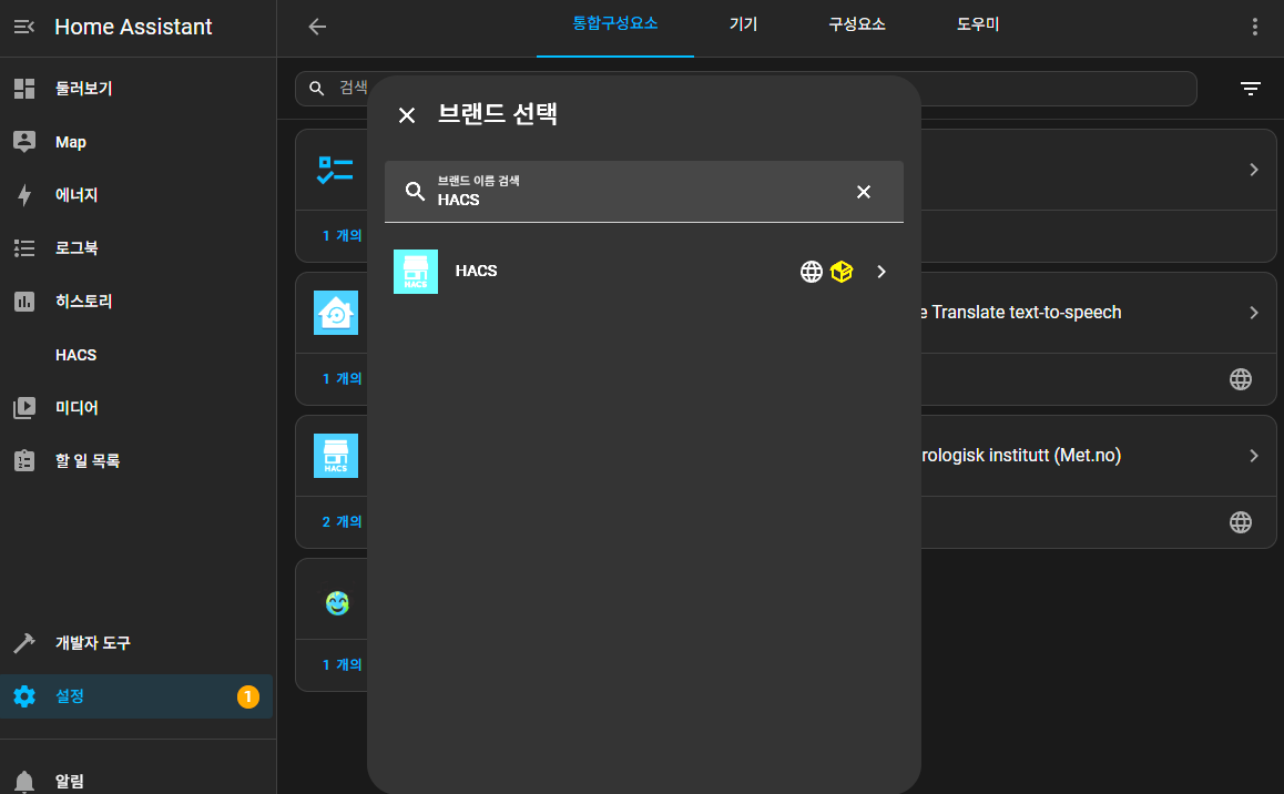 우측 하단 통합구성요소 추가하기를 눌러서 HACS를 검색한다.