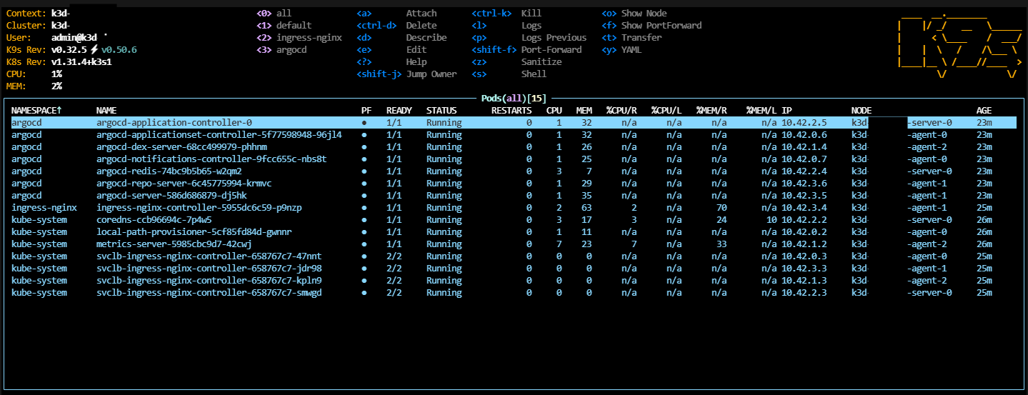 이렇게해서 K3D Cluster 생성, Ingress Nginx 설치, ArgoCD 설치까지 완료했다.