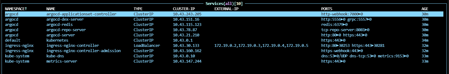 위 순서로 진행하면 k3d 클러스터에 ingress-nginx가 설치되고 아래와 같이 Load Balancer로 배포가 된다.