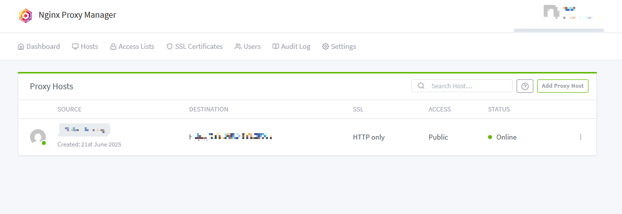 Proxy Host를 추가하면 위와 같이 추가된 호스트 정보를 볼 수 있다.